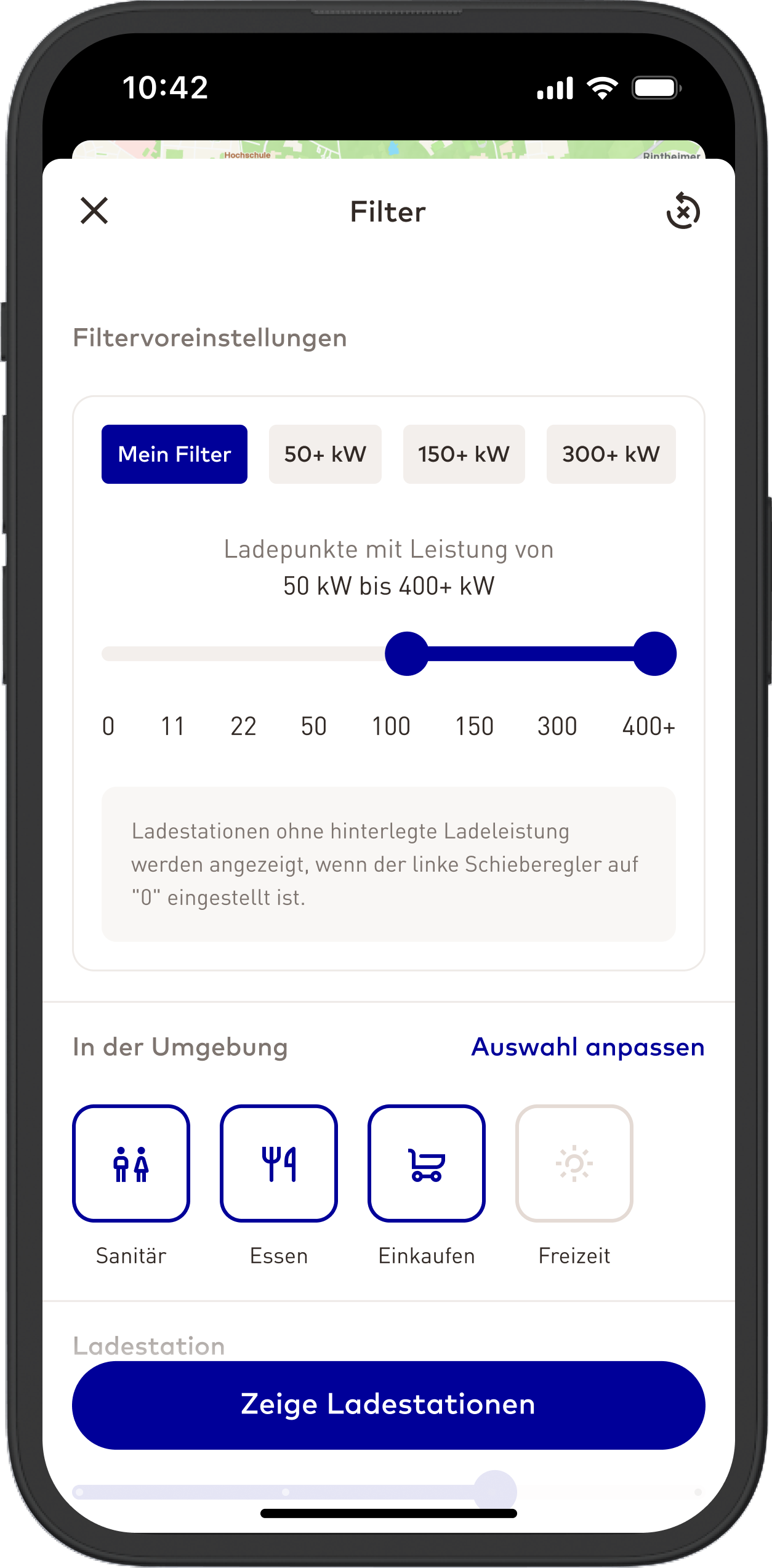Suchen Sie unkompliziert nach passenden Ladestationen in Ihrer Nähe oder auf einer geplanten Route.Per App laden