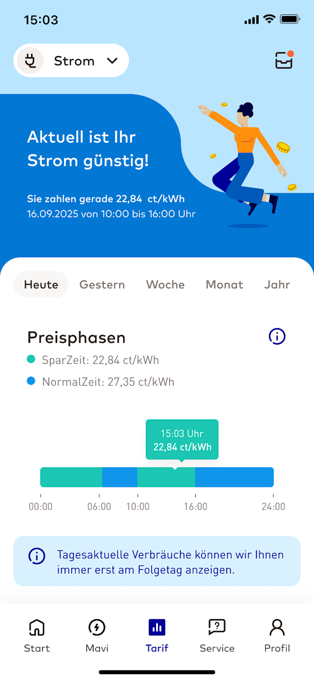 - Während des Tages gibt es feste Zeitfenster für SparZeiten und NormalZeiten. In den SparZeiten profitieren Sie von einem besonders günstigen Verbrauchspreis.