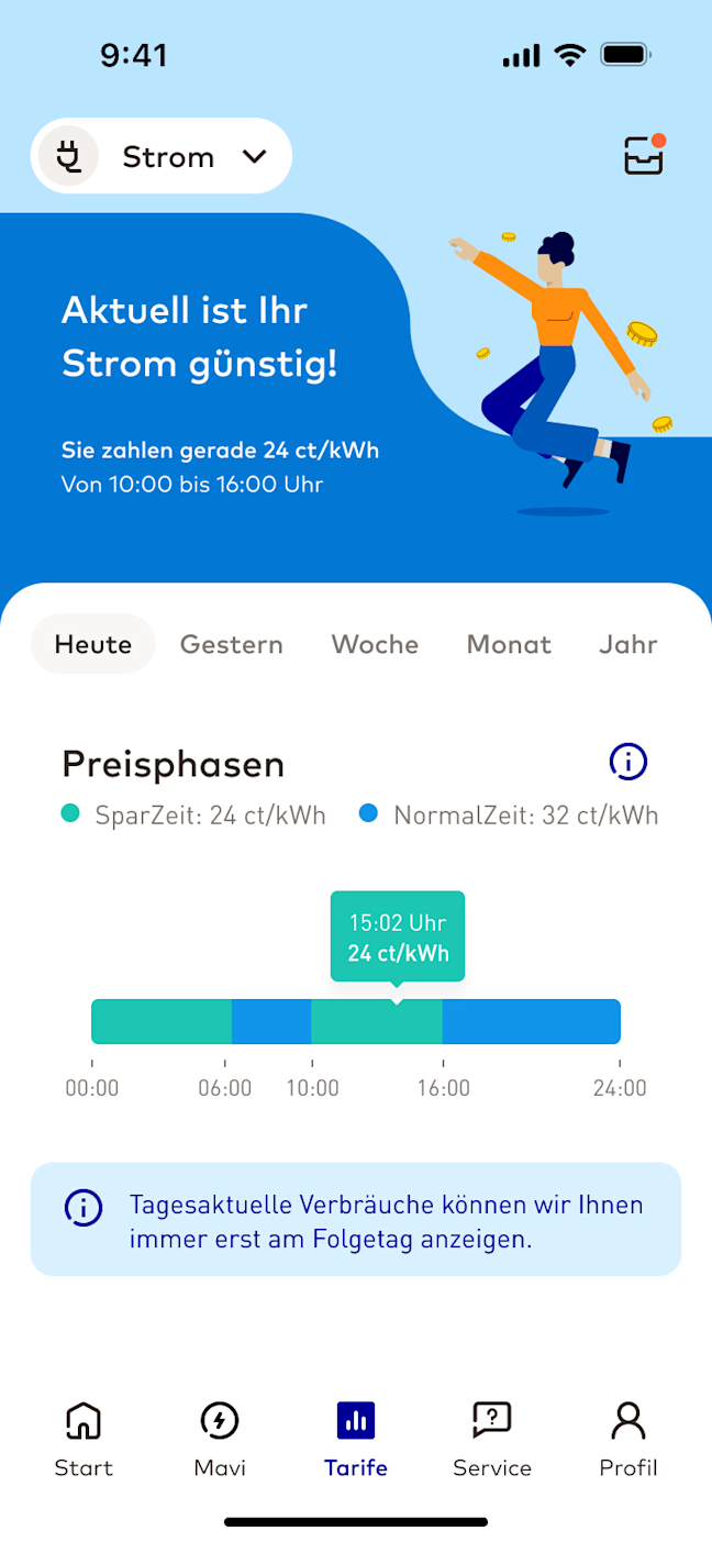 Verlagern Sie Ihre Verbräuche in günstige SparZeiten. Unsere Energie-Managerin EnBW Mavi unterstützt beim Kosten sparen.Sichere Planbarkeit